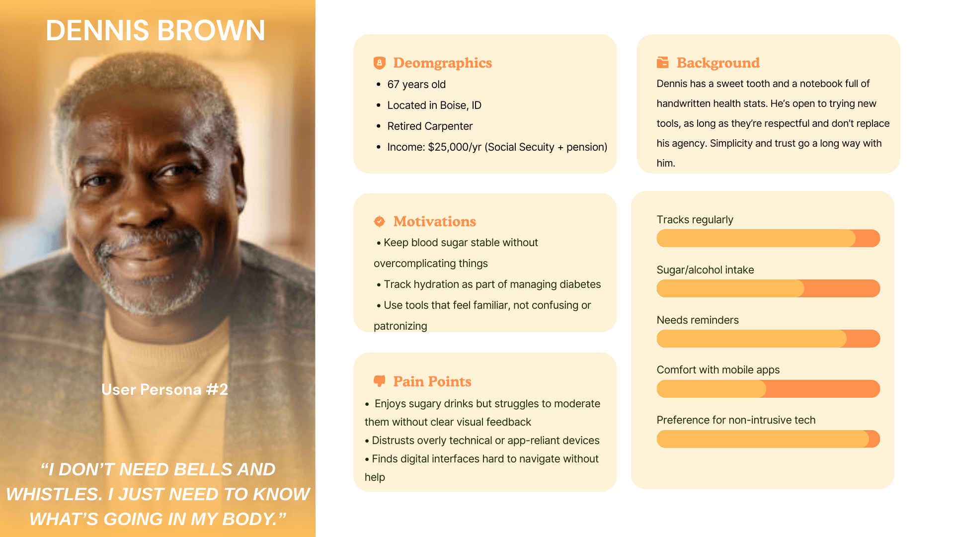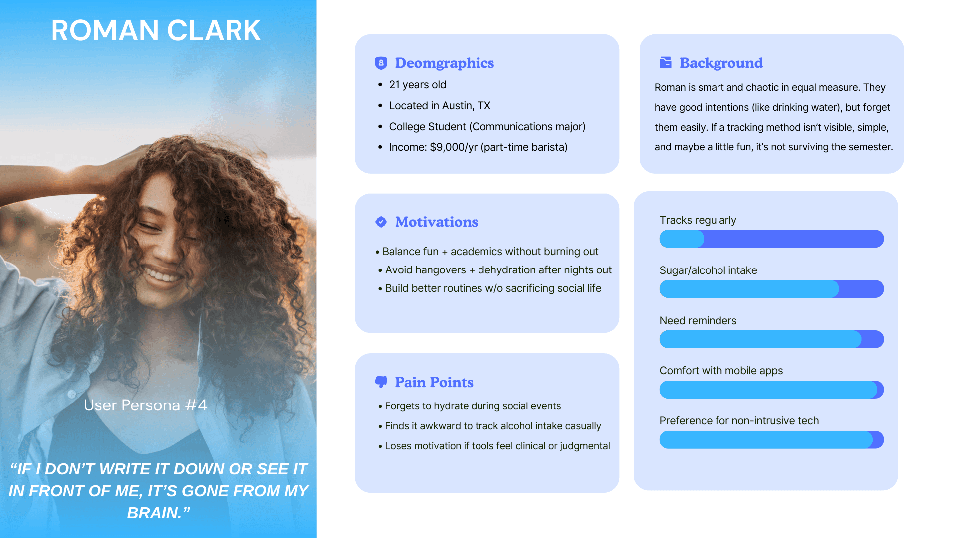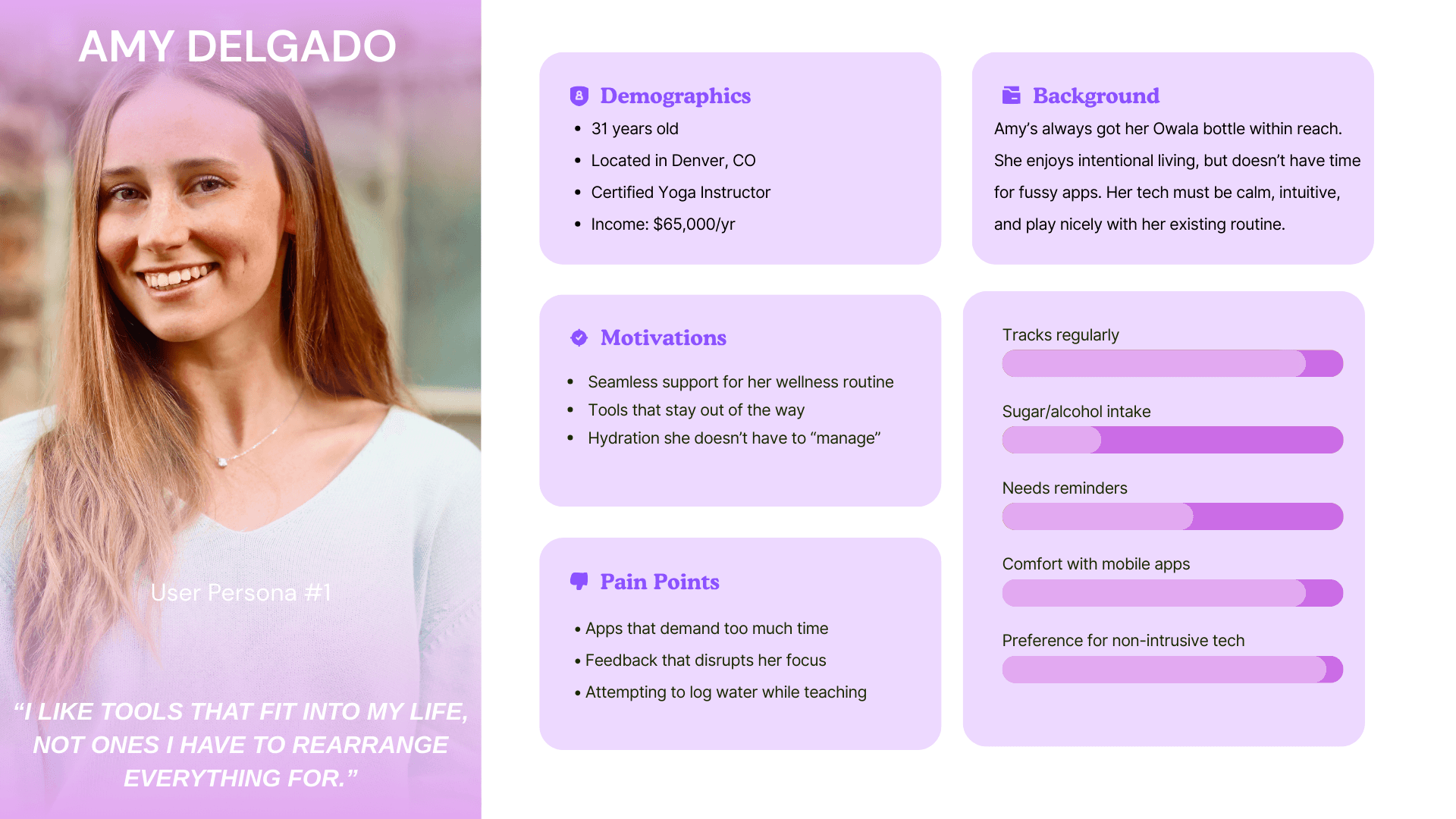 Before designing anything, I needed to understand how people track liquid intake today, and which sensory cues they naturally notice or ignore. Our research combined early discovery work with hands-on testing to pinpoint opportunities and barriers.