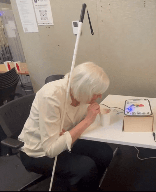 We began exploring a high-fidelity physical prototype using a cup, sensors, a straw and a feedback box. One of our key user personas is blind, and two of our guest testers were low-vision, so it was crucial that we explored tactile feedback early in our process. While our original concept centered on a smart straw, this early prototype with a tactile box allowed us to validate core feedback mechanisms—buzz, sound, and light—before refining the physical form.