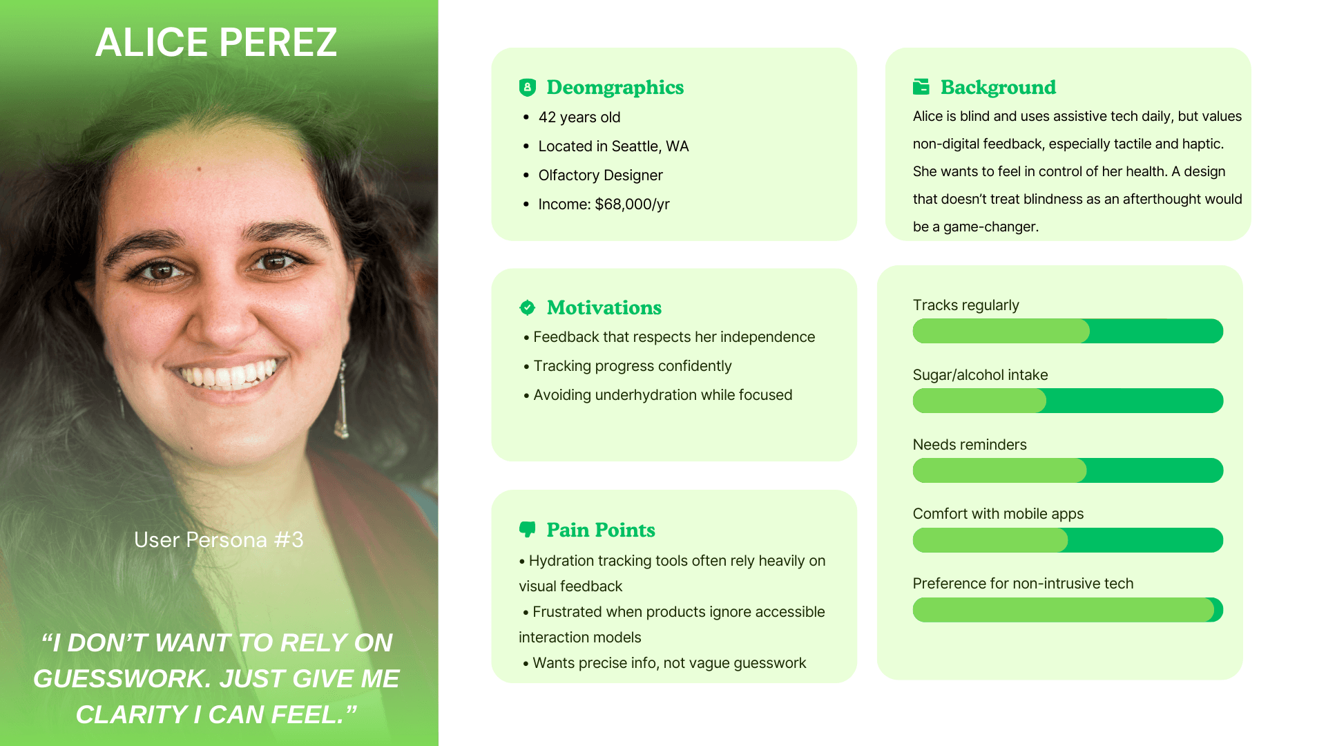 We tested our working prototype with users across a wide range of sensory needs and hydration habits.